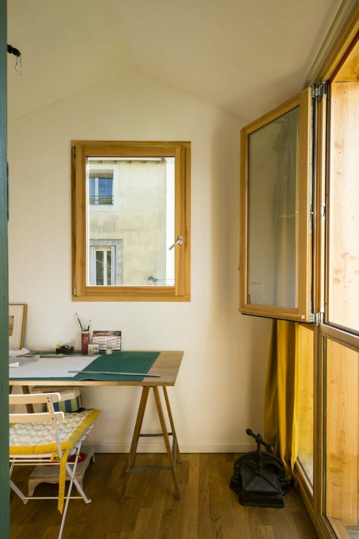 Notre client souhaitait ajouter à son bien un espace dédié à son activité de peinture. En prenant en considération les contraintes du bâtiment et notamment la dimension espace, nous réalisons les première esquisses. Nous mettons en oeuvre le projet dans une extension en bois.
